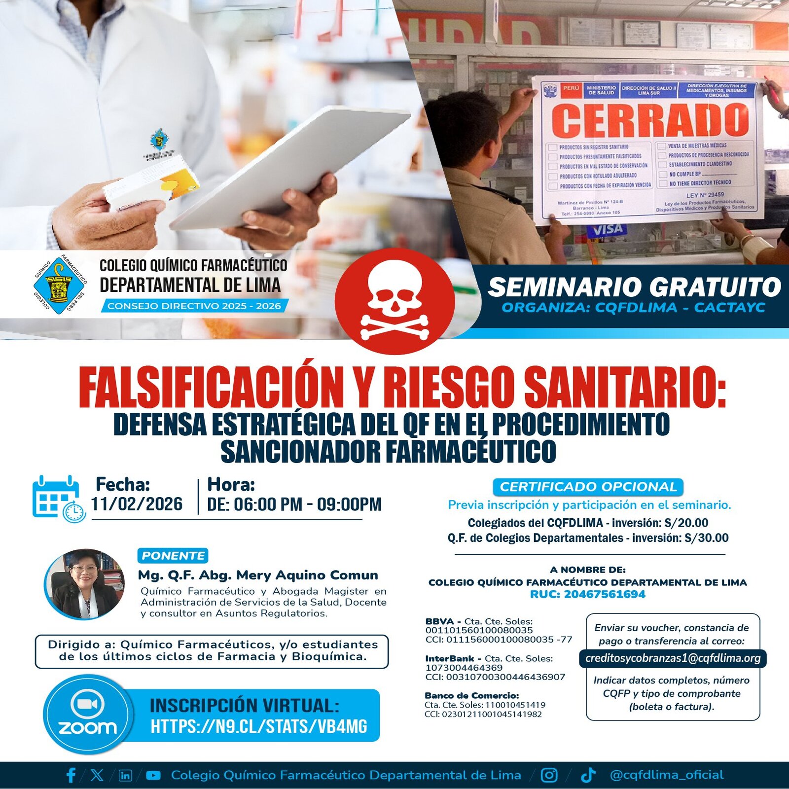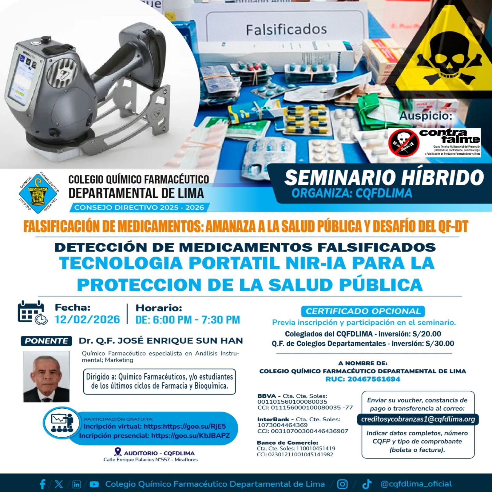 Evento académico realizado en conmemoración del Día contra la Falsificación de Medicamentos, reafirmando el compromiso del CQFDLIMA con..