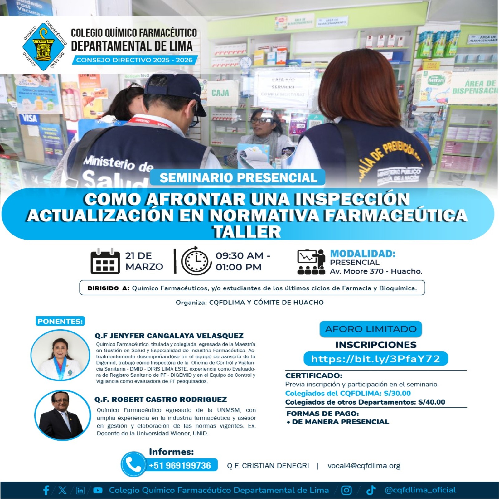 El Colegio Químico Farmacéutico Departamental de Lima, junto con el Comité de Huacho, invita a los profesionales Químico Farmacéuticos y estudiantes de los últimos ciclos de..