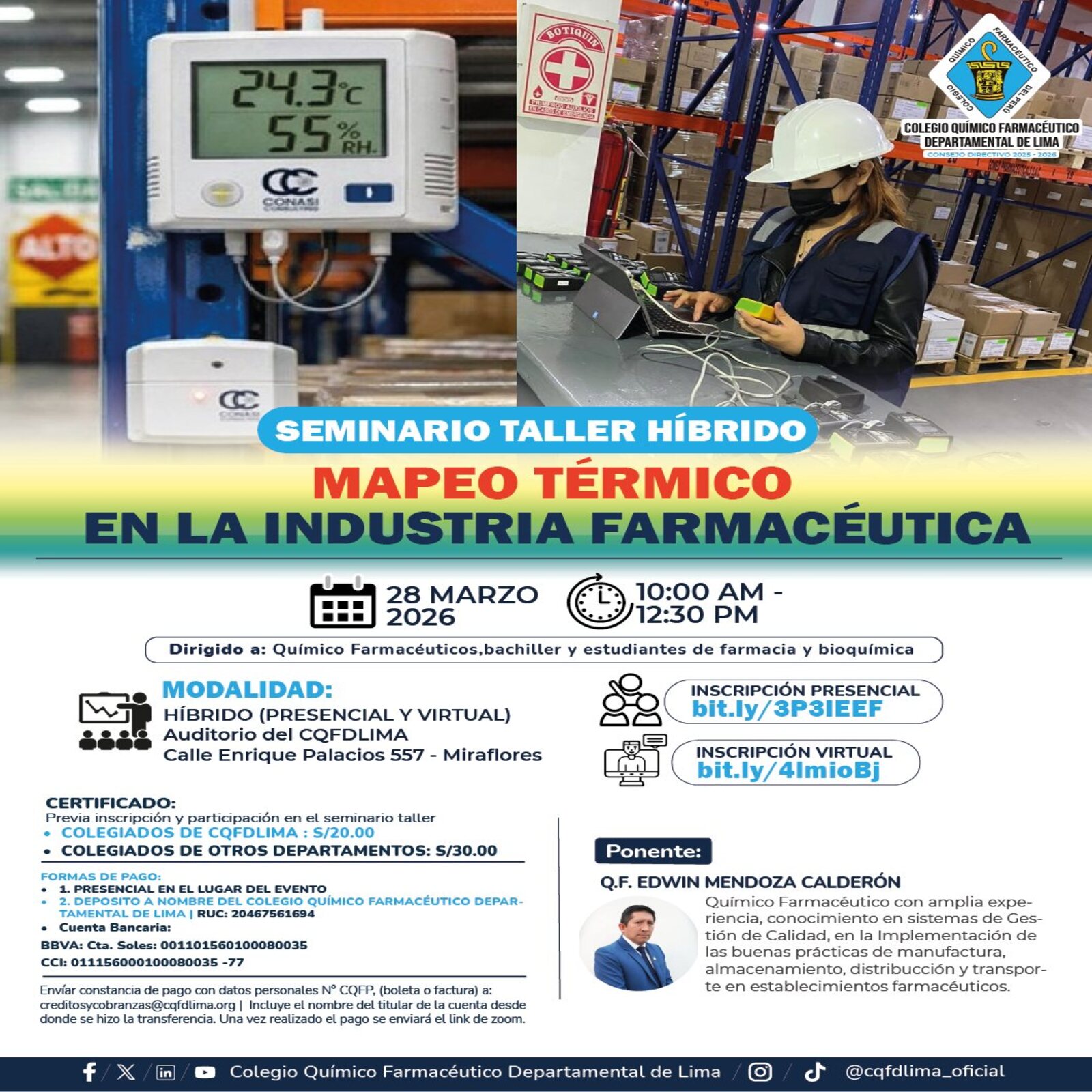 El colegio Químico Farmacéutico Departamental de Lima los invita cordialmente a participar en el Seminario Taller Híbrido – Mapeo Térmico en la Industria Farmacéutica…