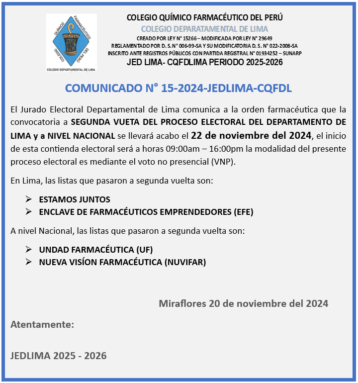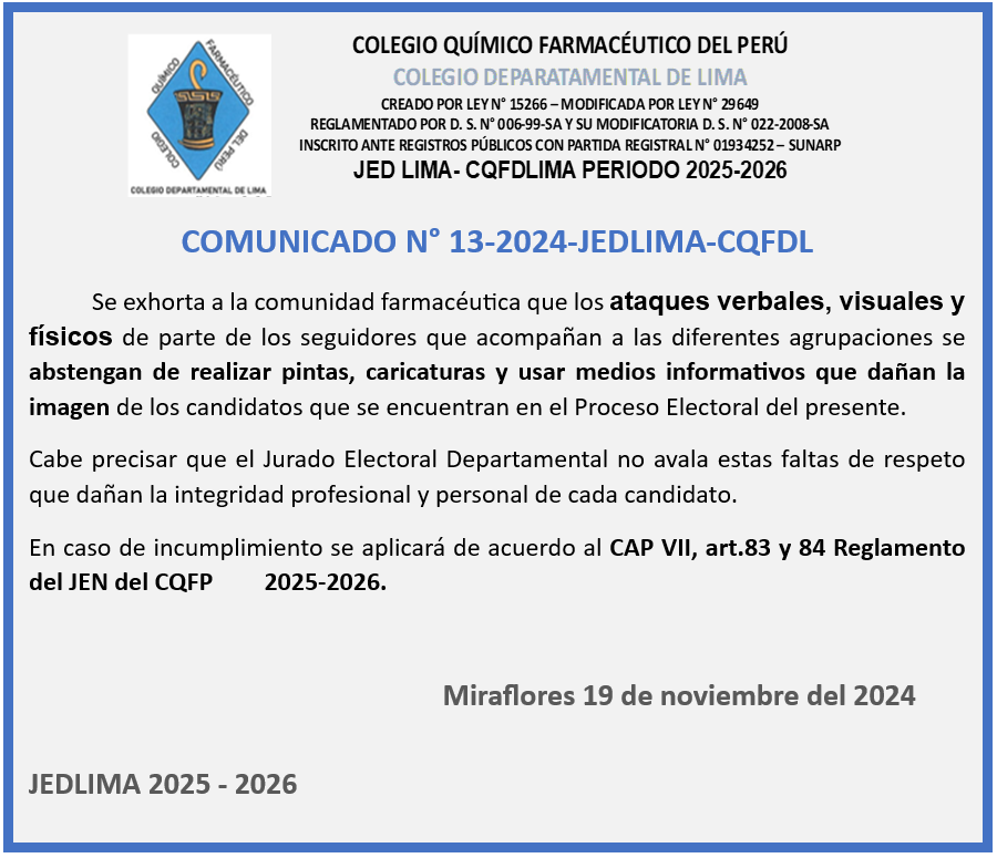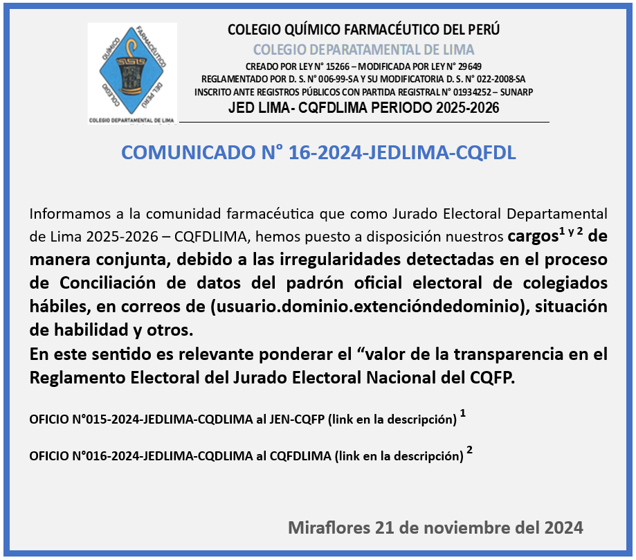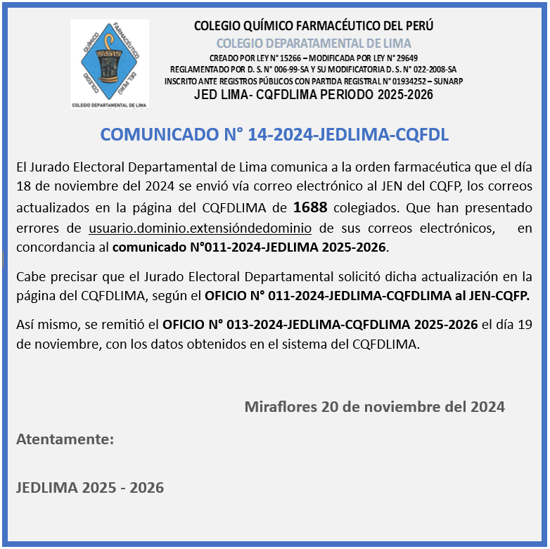 OFICIO 15 OFICIO 16 Comunicado N°15 JED - CQFDLIMA Comunicado N°14 JED - CQFDLIMA OFICIO 11 OFICIO 13 Comunicado N°13 JED - CQFDLIMA Comunicado N°12 JED - CQFDLIMA Comunicado N°11 JED - CQFDLIMA PADRÓN CON CORREOS DISTINTOS INTRANET Comunicado N°10 JED - CQFDLIMA Comunicado N°9 JED - CQFDLIMA DOCUMENTACION AQUÍ Comunicado N°5 JED - CQFDLIMA Comunicado N°6 JED - CQFDLIMA Comunicado N°7 JED - CQFDLIMA Comunicado N°8 JED - CQFDLIMA Comunicado N°1 JED - CQFDLIMA Comunicado N°2 JED - CQFDLIMA Comunicado N°3 JED - CQFDLIMA Comunicado N°4 JED - CQFDLIMA